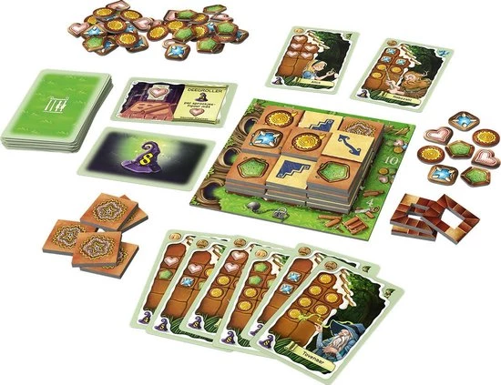 | Verpakkingsinhoud | Inhoud:, 4, spelertableaus, Bouwdelen, 60, dubbele, tegels, 28, jokers, 22, trappen, Fiches, 72, peperkoeken, Kaarten, 40, sprookjesfiguren, 20, beloningskaarten, Scoreblok, overzichtblad, spelregels |