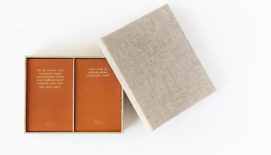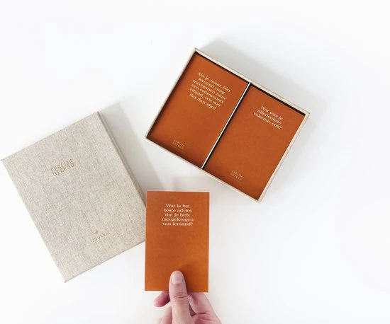 De kaarten zitten verpakt in een mooi linnen doosje met gouden folie opdruk.