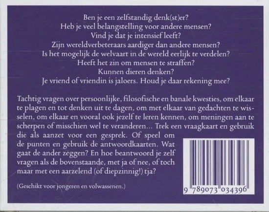 BILLEN BLOOT SPEL. Een spel met vragen rond politieke meningen, persoonlijke keuzes en banale dagelijkse praktijk: Ben je een zelfstandig denk(st)er? Heb je veel belangstelling voor andere mensen? Vind je dat je intensief leeft? Zijn wereldverbeteraars aardiger dan andere mensen? Is het mogelijk de welvaart in de wereld eerlijk te verdelen? Heeft het zin om mensen te straffen? Kunnen dieren denken? Je vriend of vriendin is jaloers. Houd je daar rekening mee? Tachtig vragen over persoonlijke, filosofische en banale kwesties, om elkaar te plagen en tot denken uit te dagen, om met elkaar van gedachten te wisselen, om elkaar en vooral ook jezelf te leren kennen, om meningen aan te scherpen of misschien wel te veranderen… Trek een vraagkaart en gebruik die als aanzet voor een gesprek. Of speel om de punten en gebruik de antwoordkaarten. Wat gaat de ander zeggen? En hoe beantwoord je zelf vragen als de bovenstaande, met ja of nee, of toch maar met een aarzelend (of diepzinnig!) tja? Doosje 9×12 cm, 80 vraagkaarten, plus 6 blanco kaarten voor eigen vragen, 22 antwoordkaarten (‘ja’, ‘nee’, ’tja’ en ‘elk antwoord is goed’) en 2 kaarten met uitleg van speelmogelijkheden.