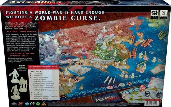 In Axis & Allies & Zombies, a new take on the iconic World War II strategy board game, each player takes command of one of the major powers, joining either the Axis or the Allies. Players then fight for victory against the opposing faction and a terrifying new foe: zombies. In this game that features streamlined game play, curveballs like chainsaw tanks and zombie mind control rays, and a zany storyline, will players survive the onslaught or succumb to the uprising?