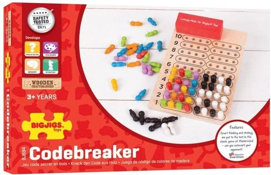 Dit leuke houten spel Codebraker van Bigjigs speel je met twee personen. Bepaal vooraf wie de kleurcode bepaalt en wie hem moet breken. De codemaker plaatst vier pionnen onder de rode kap en de codebreker moet hem raden doormiddel van het plaatsen van de gekleurde pionnen in de juiste volgorde. De codemaker plaatst na iedere beurt een witte pion voor een goede positie en kleur. De zwarte pionnen geven aan dat een gekleurde pion op de juiste plaats staat. Afmetingen 18 x 28 cm. Leeftijd 3+.