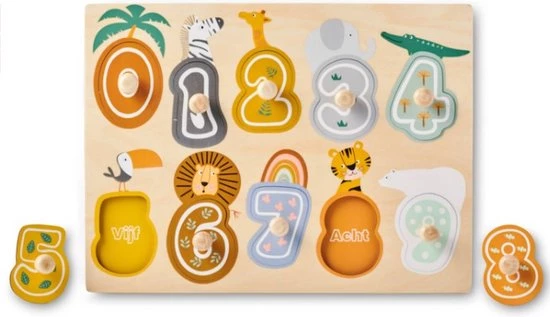 Dit leuke kleine presentje heeft een mooi vrolijk design. Het houten puzzeltje bestaat uit 3 stukjes, is hij goed gelegd? Dan verschijnt er een cijfer. Vanaf 2 jaar.