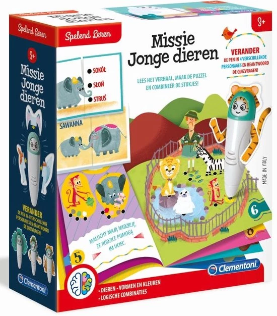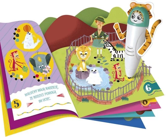 Een kit met een fantastisch verhaal om te lezen, leuke spelletjes om te spelen en spannende quizzen om op te lossen met de grappige elektronische pen! Het mooi ge?llustreerde album staat vol met educatieve activiteiten gericht op vormen, kleuren en logische associaties op dierkenmerken. Lees het verhaal, maak de puzzel en combineer de stukjes. Met de antwoorddetectiepen kun je zelf je antwoorden controleren: elke keer dat het gegeven antwoord goed is, licht de pen op en maakt hij geluid! Met de gekleurde kartonnen accessoires kun je de pen in 4 grappige karakters veranderen.