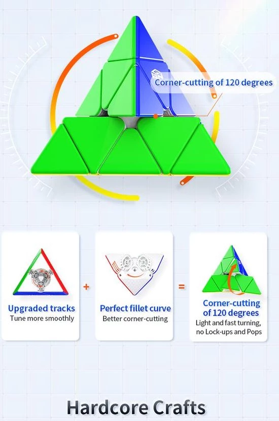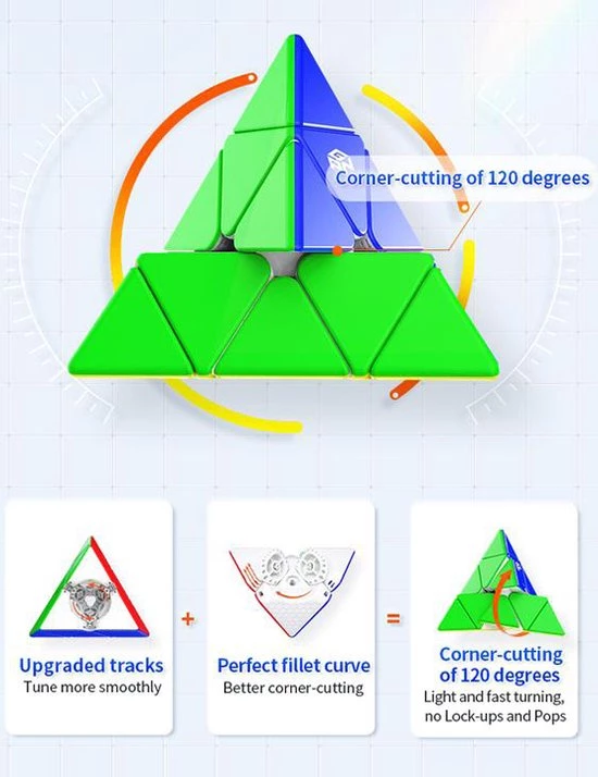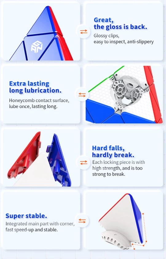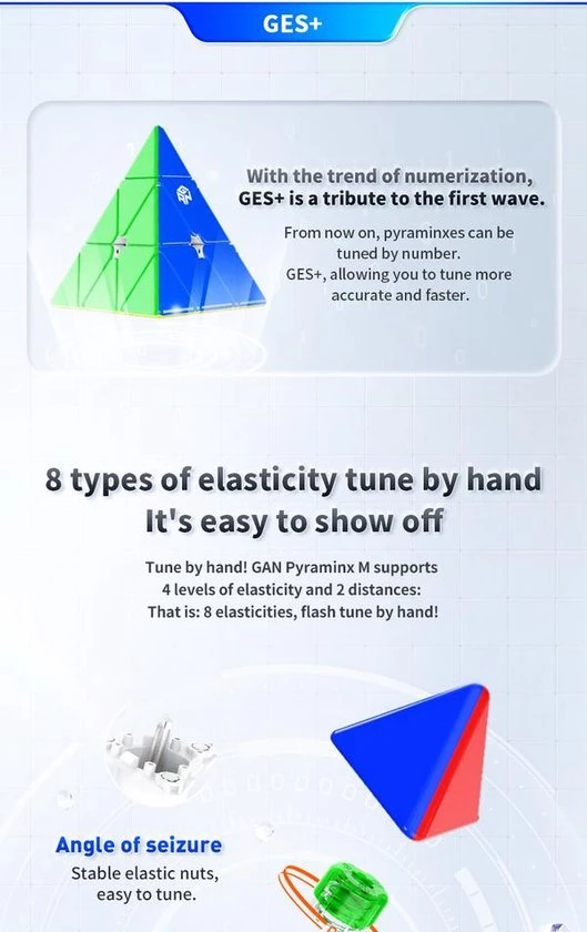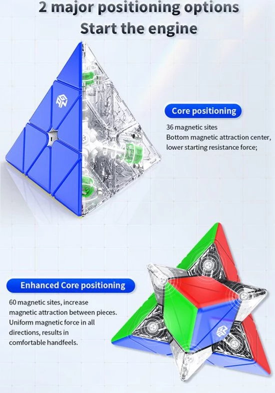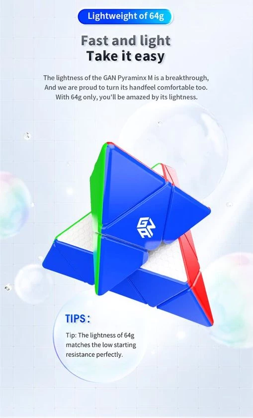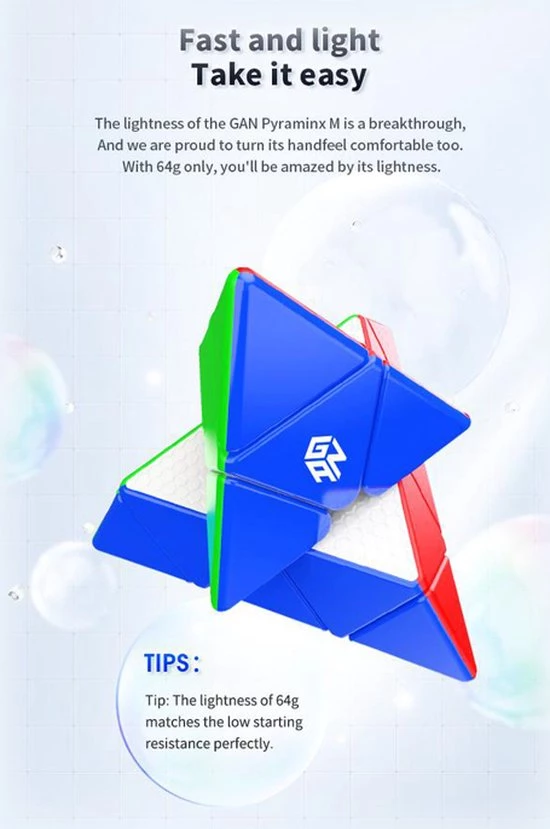 De GAN Magnetic Pyraminx is een baanbrekende release van GAN! Deze is ?s werelds eerste pyraminx met GAN?s nieuwe magnetische positioneringssysteem met kernrand. Naast dit nooit eerder vertoonde magnetische systeem, heeft de GAN Pyraminx het klassieke honingraatontwerp van GAN voor soepel en comfortabel draaien. Als je niet bekend bent met het honingraatontwerp, dit is speciaal ontwikkeld voor soepel en comfortabel draaien en helpt om het smeermiddel gelijkmatig over de puzzel te verdelen. Met een gewicht van slechts 64 gram is de GAN Pyraminx een lichtgewicht.