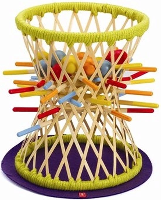 Het spel Pallina bestaat uit een grote houten korf van 24 x 24 x 32 cm, 20 bamboe staafjes en 16 houten balletjes in 4 verschillende kleuren, een basis en een handleiding.