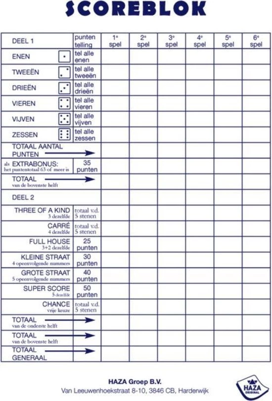 2x Scoreblok Yahtzee 250 vellen. Scoreblok om uw punten bij te houden met het dobbel spelletje Yahtzee. Dit blok bevat 250 velletjes en heeft een formaat van ca. 9,4 x 14,5 cm. Materiaal: papier. U ontvangt in totaal 2 stuks.