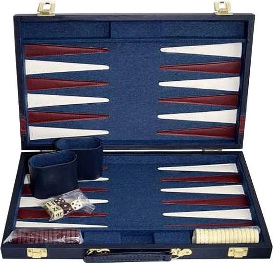 backgammon koffer blauw met rode bies. Deze backgammon koffer heeft een blauw speelveld. Met rode en witte opgestikte punten. Inclusief 2 bruine dobbelbekers, 2 x 15 stenen en dobbelstenen.