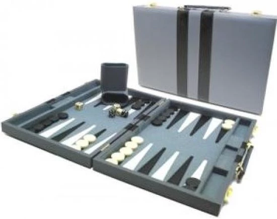 backgammon koffer grijs. Deze backgammon koffer heeft een grijs speelveld. Met zwarte en witte opgestikte punten.