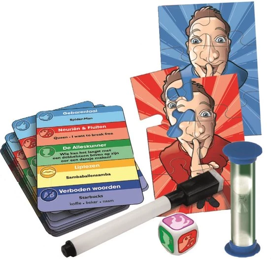 Je speelt in twee teams, gooit de quizdobbelsteen en trekt een kaart. Moet je in gebarentaal een olifant uitbeelden? Vette pech! Je teamgenoten moeten raden welk woord er op je kaartje staat, maar STIL, je mag geen geluid maken! Er zijn 60 kaartjes met 5 verschillende quizzen per kaart. De categorien zijn Gebarentaal, Neurien & Fluiten, De Alleskunner, Liplezen en Verboden woorden. Het team dat als eerste de 6 puzzelstukken heeft, heeft gewonnen … maar zodra je geluid maakt moet je weer een puzzelstukje inleveren. En je kunt je creativiteit de vrije loop laten: er zijn 10 blanco kaartjes waarop je kunt schrijven wat je maar wilt. Leef je uit!