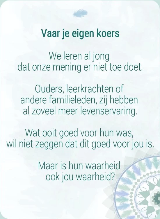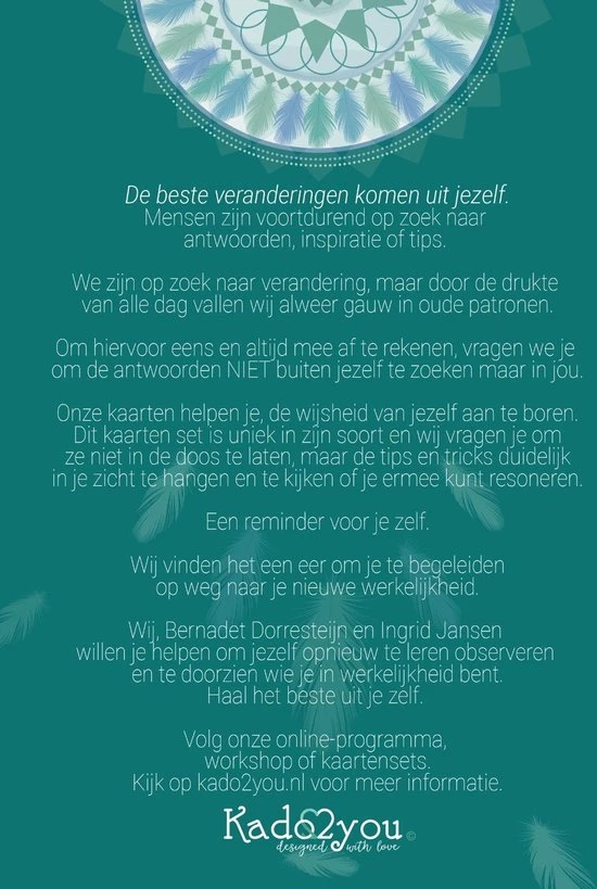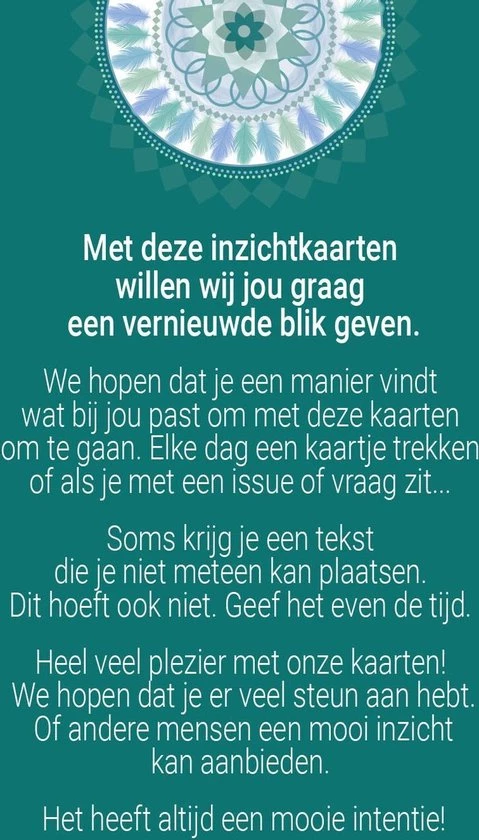 44 kaarten helpen je elke keer weer op weg om je leven door andere ogen te bekijken. Onze intentie is dat je kracht haalt uit je getrokken kaart of een ander, een mooi inzicht kan bieden. Eigen teksten en eigen ontwerp zorgen voor een orgineel kado. Met liefde gemaakt.