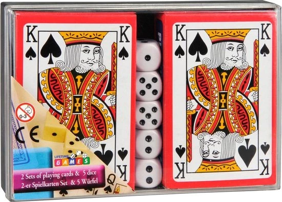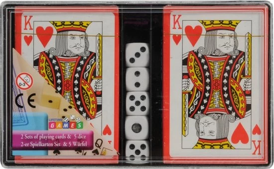 - Kunststof doosje met deksel met daarin twee speelkaartensets en vijf dobbelstenen.