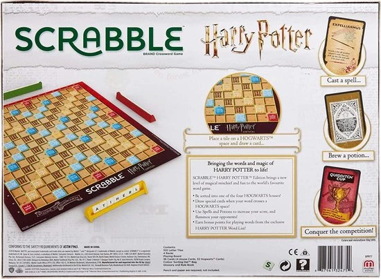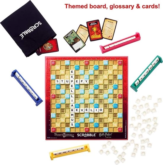 Like Original Scrabble , this game comes with a board, 4 racks, bag of tiles and instructions. But Harry Potter Edition of Scrabble also includes a special glossary for players to find wizarding words they can play with their Scrabble tiles. When a player forms a word on a Hogwarts space, that player gets to draw a magical card that can help score more points. Game includes a deck of 36 Hogwarts cards that bring even more magic to the game.