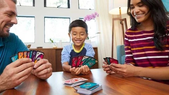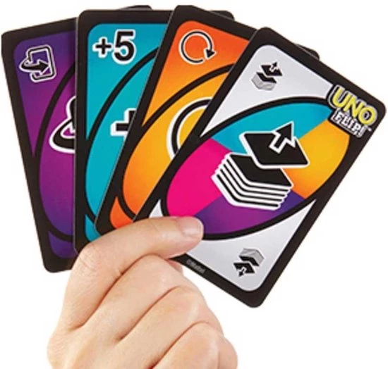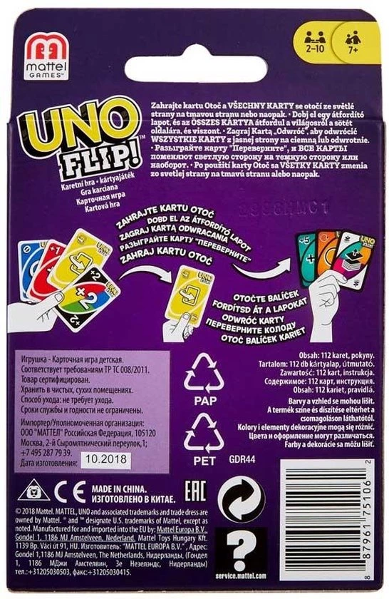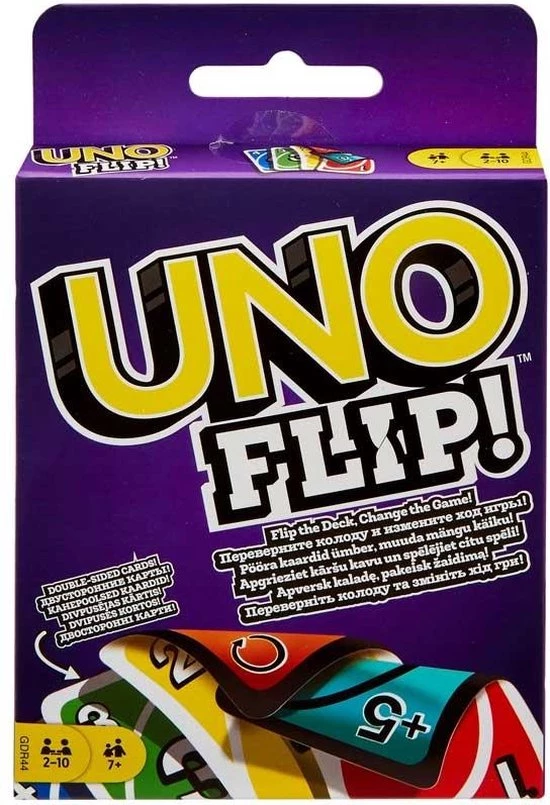 Zet je schrap voor de volgende iteratie van het klassieke UNO?, UNO FLIP! Het is de matchgame die je kent, maar met spannende nieuwe wendingen – zoals een dubbelzijdig kaartspel, speciale FLIP-kaart en zwaardere straffen – die klassieke gameplay een concurrentievoordeel geven. Er is een ?Light Side? aan het kaartspel, dat speelt als klassiek UNO, en een ?Dark Side? waar de straffen superstreng zijn. Speel de FLIP-kaart en alle kaarten in je hand, zodat de trekstapel wordt omgedraaid om een ??geheel nieuwe reeks getallen en kleuren aan de andere kant te onthullen! De houder van de FLIP-kaart bepaalt of je wel of niet aan de Light Side of Dark Side van het kaartspel speelt – en wanneer je deze weer omdraait. De Dark Side van het kaartspel bevat nieuwe actiekaarten die de zaken echt opschudden, zoals Draw Five en Skip Everyone-kaarten. Bedenk een strategie om uw concurrentie te laten rammelen en wees de eerste die uw kaarten kwijt is om te winnen. Als je nog maar ??n kaart hebt, vergeet dan niet “UNO” te roepen! Liefhebbers van kaartspellen kunnen nu UNO FLIP spelen! krijgen in een stevig opbergdoosje dat ideaal is voor opslag en reizen. Dit leuke familiekaartspel is perfect voor kinderen van 6 jaar en ouder.
