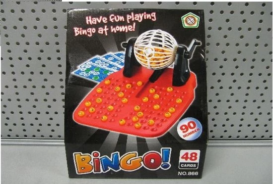 Bingo spel gekleurd/geel complete set nummers 1-90 met molen, fiches en bingokaarten. Compleet bingospel, bestaande uit: een bingomolen met gekleurd sorteerbord/controlebord (kleur is willekeurig, kan afwijken van de foto), 90x gele balletjes, 52x fiches en 48x bingo speelkaarten. Bingostiften en extra bingokaarten niet inbegrepen, maar wel los verkrijgbaar in deze webshop.