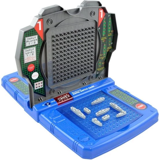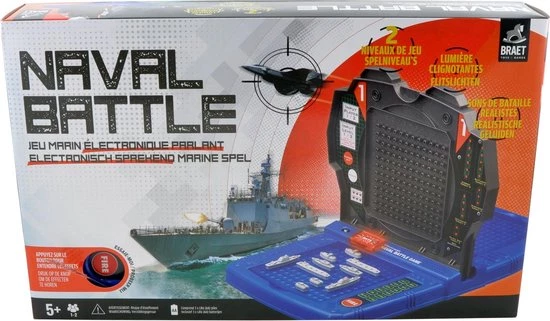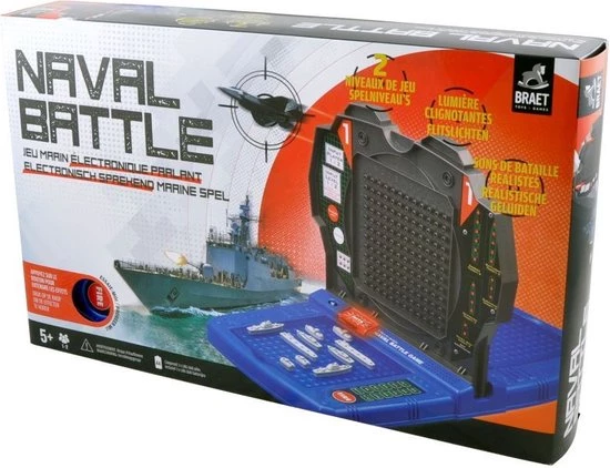 De elektronische versie van het klassieke zeegevecht spel. Met 2 spelniveau’s: basis of ervaring (met snelvuur modus). Je kan alleen spelen (tegen de computer) of met z’n 2 (tegen elkaar). Met licht- & geluidseffecten alsof je middenin het zeegevecht zit! Met Nederlandse en Franse stem. Je kan het spel toeklappen en zo alle toebehoren opbergen. Naval Battle combineert het plezier van het klassieke spel met nieuwe interactieve elektronische elementen. Betrek je tegenstanders in een klassieke slag om de nieuwe snelvuurmethode uit te proberen. Hierbij telt de vuurkracht van ieder schip! Speel tegen de hyperintelligente computer of daag een vriend uit en ontdek wie de beste admiraal is. Gierende raketten en krachtige explosies zijn een paar van de fantastische geluidseffecten die je meer dan ooit het gevoel van echte actie geven. – 10 miniatuurschepen – flitslichten – controle-eenheid – vuurknop