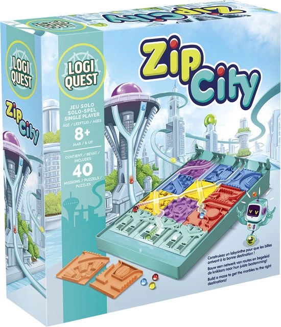 Jij moet ervoor zorgen dat alle Zippysferen tijdig hun eindstation bereiken. Rangschik de Spoortegels van de stad, cre?er paden, en breng de knikkers in de juiste volgorde naar hun gevraagde bestemming. Met 40 Puzzelkaarten die je creatieve, logische en intu?tieve denkpatronen stimuleren, biedt Zip City oneindig veel speelplezier voor kinderen ?n volwassenen!