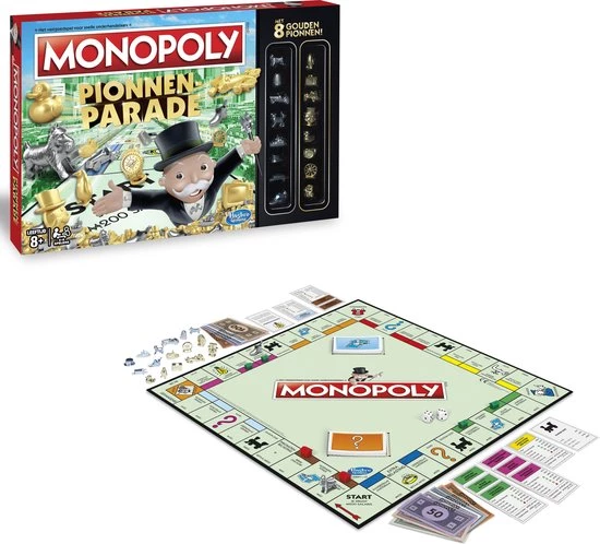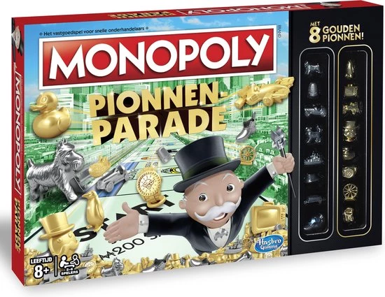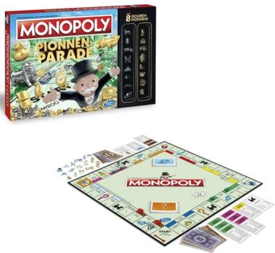 Deze Monopoly Pionnenparade bevat naast de 8 klassieke pionnen nog 8 extra gouden pionnen die zijn geselecteerd om de 8 categorieën te vertegenwoordigen in de pionverkiezingen in januari 2017. Koop en verhandel bezittingen, in huur en laat je tegenstanders failliet gaan.