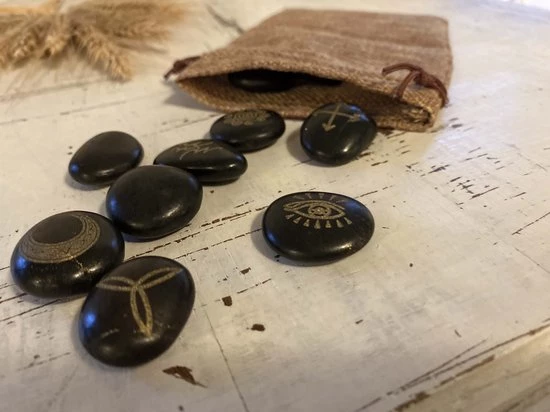 De set bestaat uit 13 mooie platte basalt stenen en in een mooi jute zakje. Elke steen is uniek dus ze kunnen enigszins afwijken van de foto’s