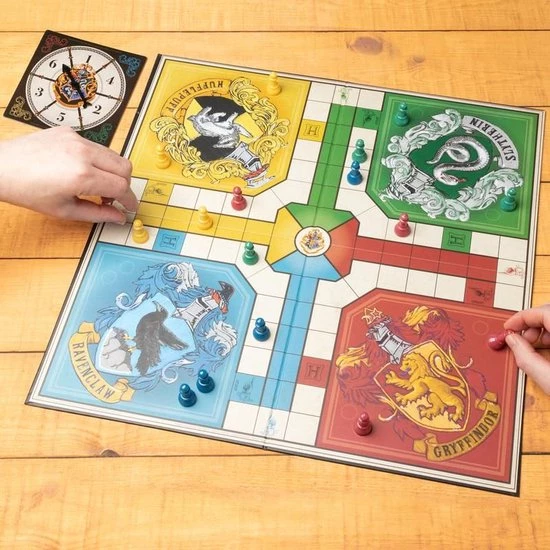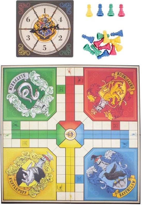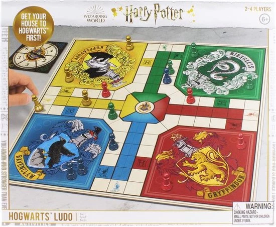 Hogwarts Ludo spel van Harry Potter. Spelletje ge?nspireerd op Mens Erger Je Niet, waarbij je als eerste met al je pionnen je huis moet bereiken. Leuk spel voor liefhebbers van de Harry Potter films en boeken, die op een originele manier het spel Ludo/Mens Erger Je Niet willen spelen. Het spel is geschikt vanaf zes jaar en voor twee tot vier spelers. Dit is een officieel gelicenseerd product.