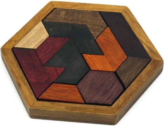 - Een leuke geometrische puzzel voor jong en oud. De puzzel bestaat uit 11 houten puzzeldelen. Er zijn meerdere manieren om deze puzzel in elkaar te zetten. Door de zeshoekige hexagon vorm is het een echte uitdaging om elk puzzelstukje passend te krijgen.