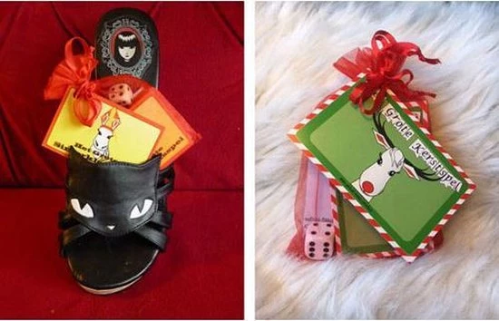 Beide spellen is zijn gezelschapsspellen voor de feestdagen waarbij met een dobbelsteen en vraagkaartjes om cadeautjes wordt gespeeld.