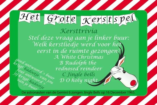 De dobbelsteen bepaalt verplaatsingen en of er een kaart mag worden gepakt. Op de kaartjes staan opdrachten ? zoals bijvoorbeeld: hints, Kerst- of Sinterklaasliedje afmaken, pictonairy, de jongens tegen de meisjes, enz. en vragen over leuke Sint- of Kerstweetjes, bijvoorbeeld: ‘Noem drie namen van de rendieren van de Kerstman.’ en ‘Hoe lang wordt Sinterklaas al gevierd in Nederland?’