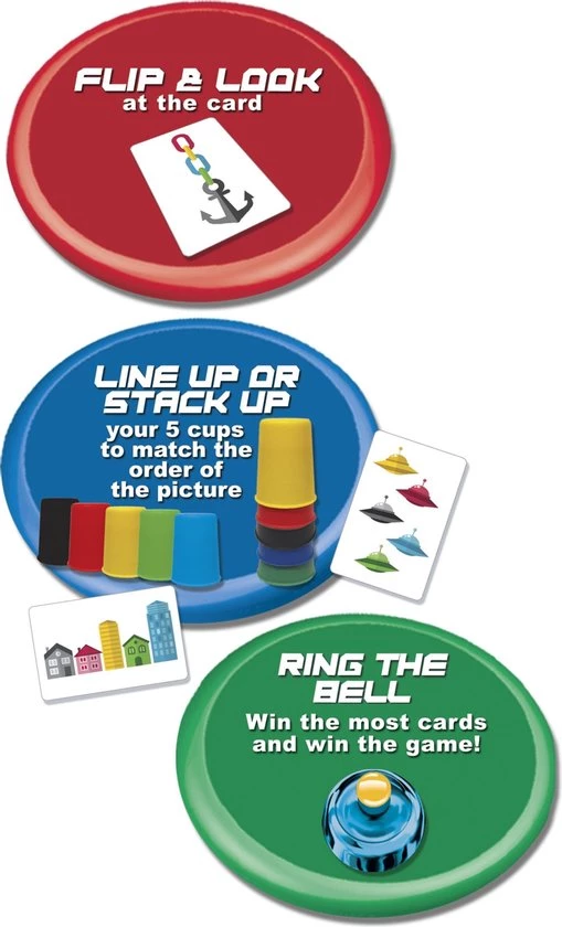 als de afbeelding. Als de afbeelding horizontaal is, lijn je je kopjes omhoog. Als de afbeelding verticaal is, stapelt u ze op. Eindig als eerste en bel maar – je hebt zojuist de kaart gewonnen! Win de meeste kaarten nadat alles is gespeeld en je wint het spel! QUICK CUPS is match e’m up, stapel ze leuk!