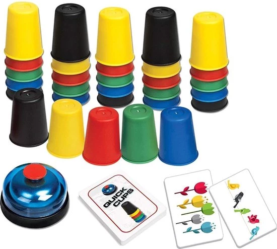 QUICK CUPS is het snelle familiespel waarbij kopjes bij elkaar worden gebracht en op een foto worden gestapeld! Elke speler krijgt een set van vijf kopjes in vijf verschillende kleuren. Wanneer een afbeeldingskaart wordt omgedraaid, racet iedereen naar de rij of stapelt zijn bekers op in dezelfde volgorde