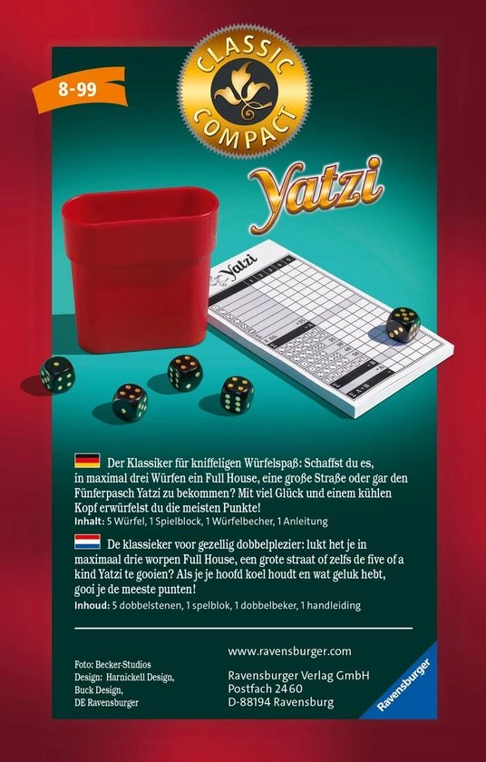 Ravensburger Yatzi Pocketspel is de klassieker voor gezellig dobbelplezier: lukt het je in maximaal drie worpen Full House, een grote straat of zelfs de five of a kind Yatzi te gooien? Als je je hoofd koel houdt en wat geluk hebt, gooi je de meeste punten!