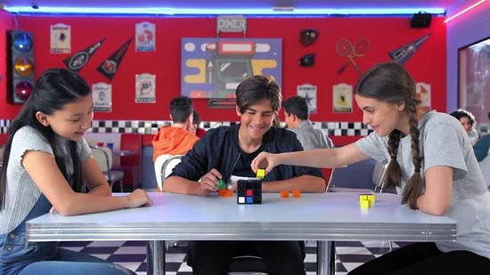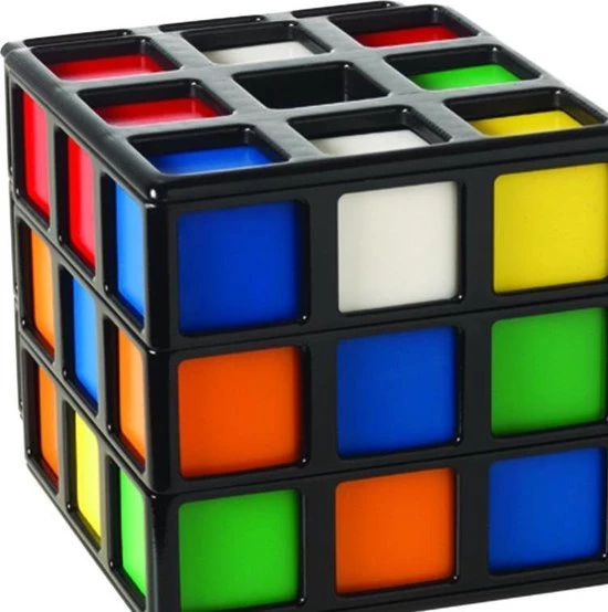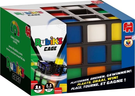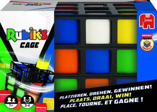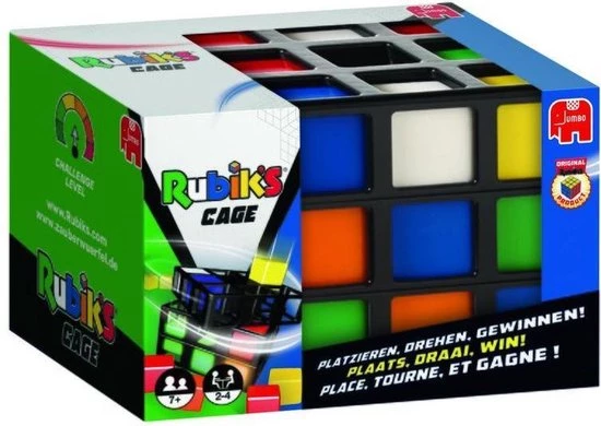 Draaien, Wenden, Keren en Winnen! Rubik’s Cage is voor 2-4 spelers. De speler die als eerste aan een zijde van de Rubik’s Cage 3 cubies van dezelfde kleur op een rij heeft – verticaal, horizontaal of diagonaal – is de winnaar!