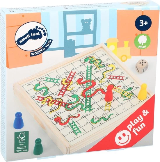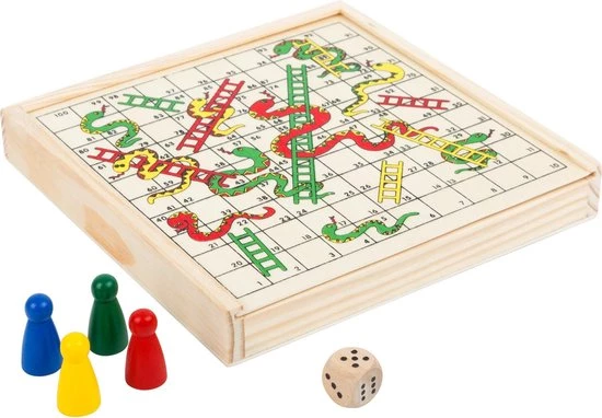 Een leuk spel voor onderweg! De ogen van de dobbelstenen geven aan hoeveel stappen iedereen mag zetten. Met een ladder of een slang wordt het pad ingekort of verlengd. Dit compacte bordspel gemaakt van hout is perfect voor onderweg en onderweg!