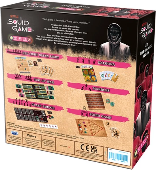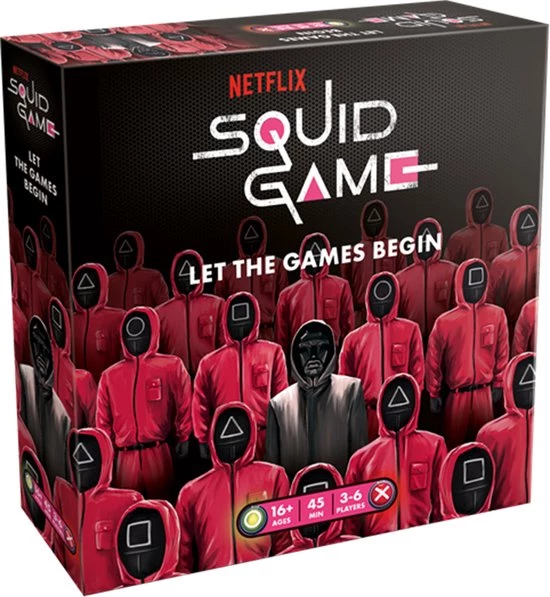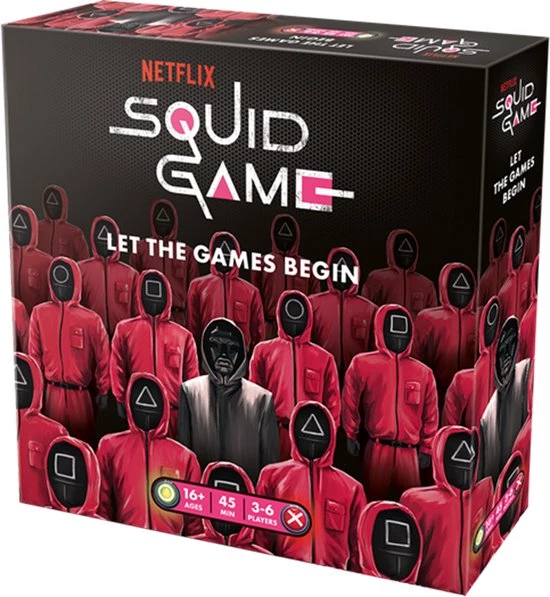 Deze spannende partygame is gebaseerd op de gelijknamige Netflix-serie. Met je persoonlijke team moet je het opnemen tegen de teams van je tegenstanders. Door middel van bluf, geluk maar ook keiharde tactieken moet je zes kaartspellen overleven gebaseerd op de dodelijke rondes uit de serie. Wie aan het einde het laatst overeind blijft, wint Squid Game!