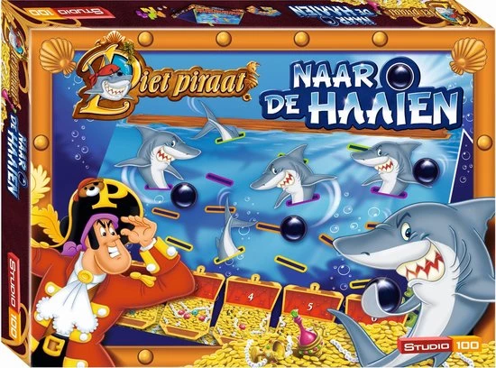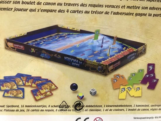 | Verpakkingsinhoud | Speelbord<br, />16, Haaienkaartjes<br, />8, Schatkistkaartjes<br, />1, Gewone, dobbelsteen<br, />1, Kleuren, dobbelsteen<br, />1, Kanonsbal<br, />Spelgegels |