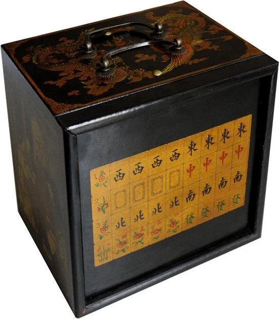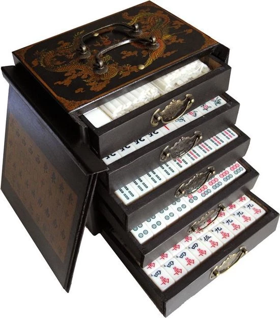 Mahjong in houten kistje met vijf lades