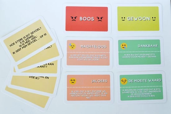 Leg de vijf kaarten met de basisgevoelens op tafel. Laat het kind of jongere de kaart kiezen die zijn of haar gevoel het best omschrijft. Bekijk daarna de lastige en leuke gevoelskaarten. Welke van deze gevoelens schuilt achter het basisgevoel? Probeer vervolgens samen enkele bijhorende vragen te beantwoorden: