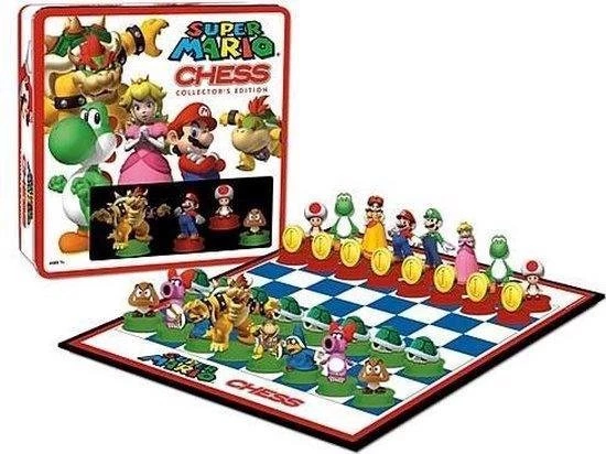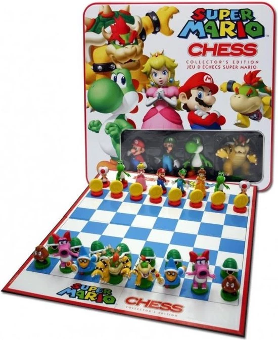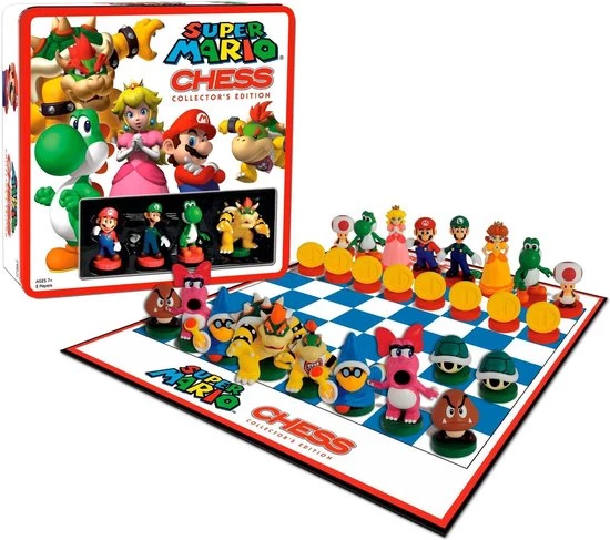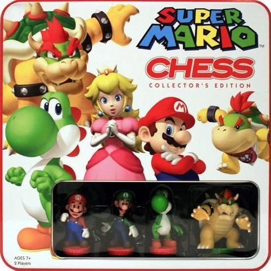 Schaken met Super Mario! Deze Super Mario editie volgt dezelfde regels als het reguliere schaakspel, maar dan met fraaie speelstukken en een speciaal bord. De ene speler speelt met Mario’s Heroes speelstukken en de ander met Bowser’s Troop speelstukken.